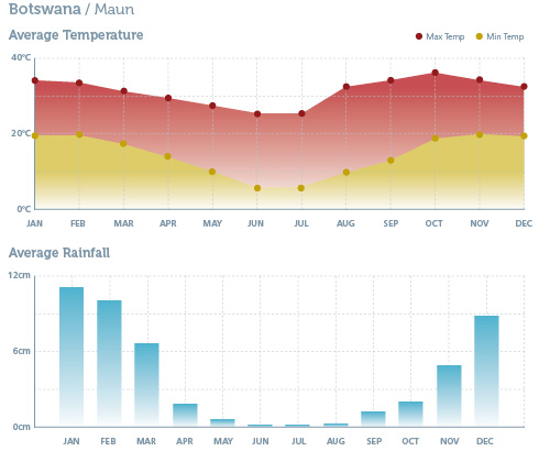 Botswana can be visited all year round. July to October is the dry season and the best time to view large herds as they gather at water sources, particularly in Chobe.