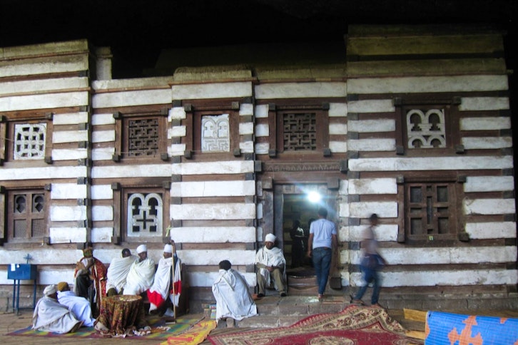 Your guide and driver will collect you from your hotel after breakfast. You will be taken to visit the second group or cluster of the churches, which represent the 'heavenly Jerusalem'. In this group are the Bete Gabriel & Bete Raphael; Bete Merquorios; Bete Emmanuel (God with us), and Bete Abba Libanos. Those who wish, can take a 40 meter walk through a very dark tunnel between two of the churches, symbolising the journey from hell to heaven. After visiting the churches, you will be taken to the town for lunch at a restaurant such as Seven Olives, where the outside seating area in the gardens is delightful - birding, as it says in a signpost there, is excellent. After lunch, set off on the 40km drive through mountainous countryside to the the cave church of Yemrehane Kristos. This is remarkable - quite unlike any of the others you will have visited and an impressive experience. Your guide will ask for one of the priests to show you some intricately formed Ethiopian crosses and paintings.