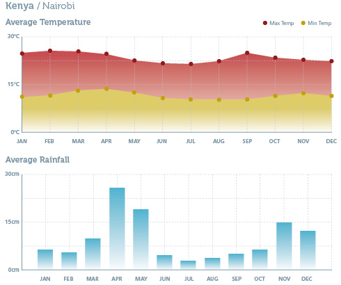 With Kenya’s diverse geography, there is considerable regional variation in climate. Generally, the best times to visit are between December and March, and from June to October. The rainy periods are the April/May ‘long rains’ and November ‘short rains’.