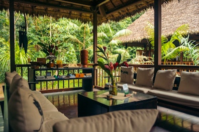 The TRC lodge is built from traditional materials such as wood, palm fronds and clay and features 18 bedrooms with private bathrooms and a common area for dining. The bedrooms are separated by light cane walls and whilst private are not soundproof. All rooms are open onto the rainforest enabling you to experience the unique ecosystem from your hammock. Hot water showers are available and the electricity generator is turned on once a day allowing guests to recharge cameras. In the evenings relax in the dining room and bar with lamps and candles enhancing the remote feel.