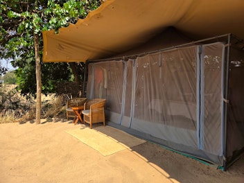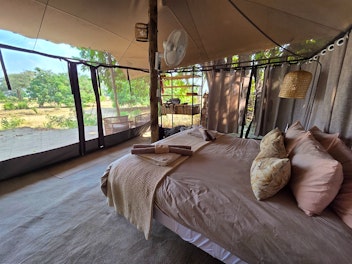 There are five tents to choose from, with a sixth planned for 2026. Each is simple by design: a mesh-walled bedroom beneath a wide canvas roof, giving you a clear sense of the island’s sights and sounds. You sleep on a large double or twin setup, with curtains around the tent for privacy. The outdoor bathroom has a bucket shower, non-mains water and a flush toilet, with zipped entrances. It’s a practical, down-to-earth setup that’s great if you enjoy a more adventurous style of safari, where the focus is on fresh air, open views and time surrounded by wildlife.