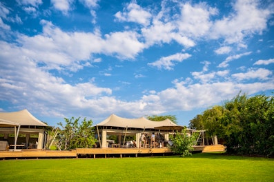 Reopened in 2021 after an extensive refurbishment, the island’s two camps feature beautifully designed tented suites in soft, uplifting tones, blending with the surrounding mopani forest, serene lake and sweeping floodplains.